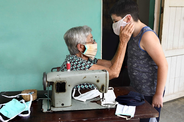 美國制裁之下,古巴民眾艱難抗疫。2020年5月27日,在古巴首都哈瓦那郊外,87歲的古巴老人伊賴達·埃爾南德斯在家中為孫子戴上她自己制作的口罩。新華社發(華金·埃爾南德斯攝)