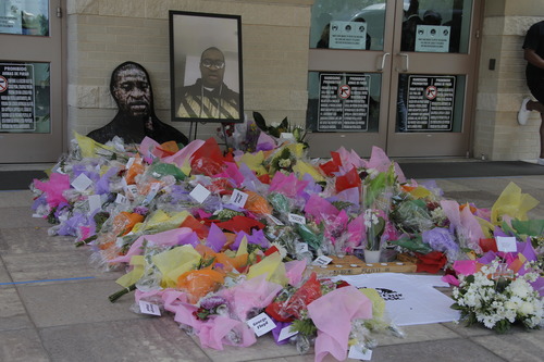 2020年6月9日,在美國得克薩斯州休斯敦,舉行弗洛伊德葬禮的教堂外擺滿鮮花。(新華社發,勞承躍攝)