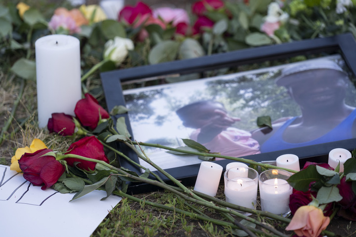 2021年5月25日,在美國華盛頓白宮附近舉行的悼念弗洛伊德的集會上,人們將鮮花和蠟燭擺放在弗洛伊德和家人的照片旁。(新華社記者 劉杰 攝)