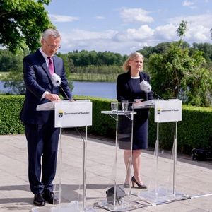 6月13日,瑞典首相安德松(右)與到訪的北約秘書長斯托爾滕貝格在瑞典首都斯德哥爾摩以西約120公里的哈普松德首相夏季莊園出席新聞發布會。