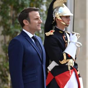 5月7日,在法國巴黎愛麗舍宮,法國總統(tǒng)馬克龍檢閱儀仗隊(duì)。(新華社發(fā))