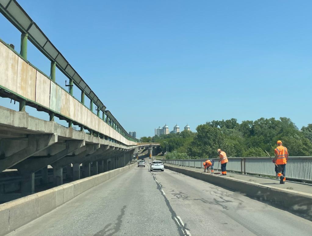 6月20日,市政人員在烏克蘭基輔修復受損的地鐵橋路面。新華社記者李東旭攝