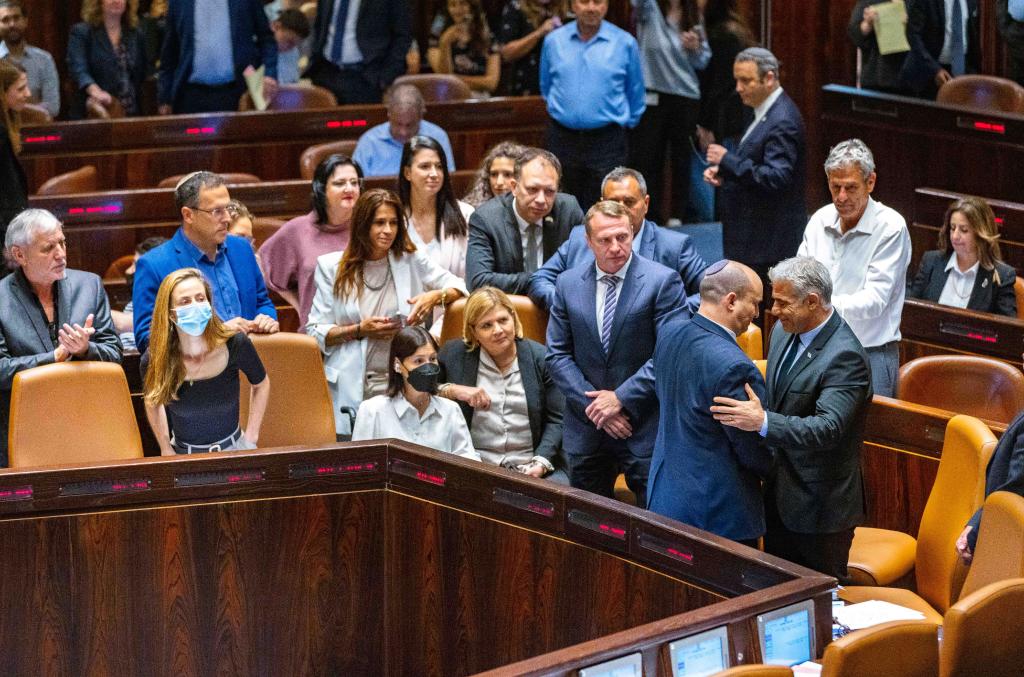 6月30日,在位于耶路撒冷的以色列議會,貝內特(前右二)和拉皮德(前右一)參加議會全會。(新華社/基尼圖片社)