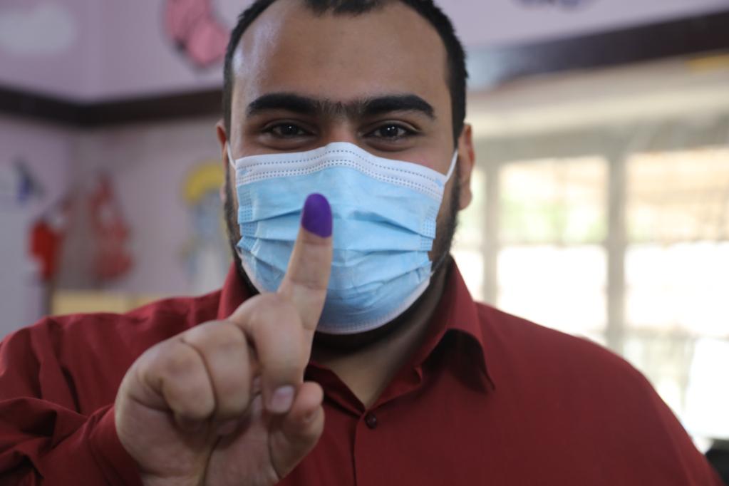 2021年10月10日,一名伊拉克選民在巴格達參加新一屆國民議會選舉投票后展示蘸過墨水的手指。新華社發