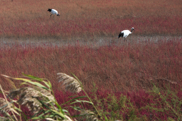 在位于盤錦的遼河三角洲濕地包括蘆葦沼澤、淺海海域、河流庫塘、水稻田等濕地類型。特殊環境孕育出的堿蓬草鋪滿灘涂,一到秋天這里就成了“紅色海岸線”。新華社記者王乙杰攝