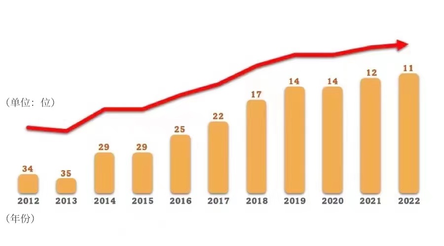 十年來,中國的全社會研發(fā)投入與國內(nèi)生產(chǎn)總值的比例由1.91%提高到2.44%;2021年中國全社會研發(fā)經(jīng)費是2012年的2.7倍,基礎研究經(jīng)費是2012年的3.4倍;據(jù)世界知識產(chǎn)權組織發(fā)布的《全球創(chuàng)新指數(shù)2022》,中國排名從十年前第34名上升至第11名。