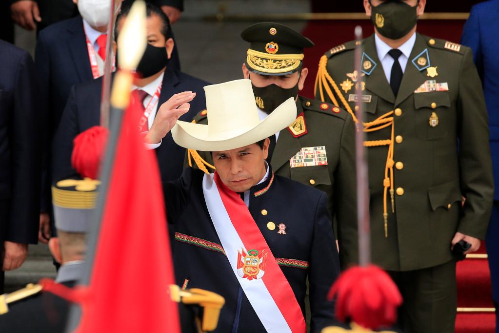 2021年7月28日,在秘魯首都利馬,卡斯蒂略在宣誓就職后檢閱儀仗隊(duì)。新華社發(fā)(瑪利亞娜·巴索攝)
