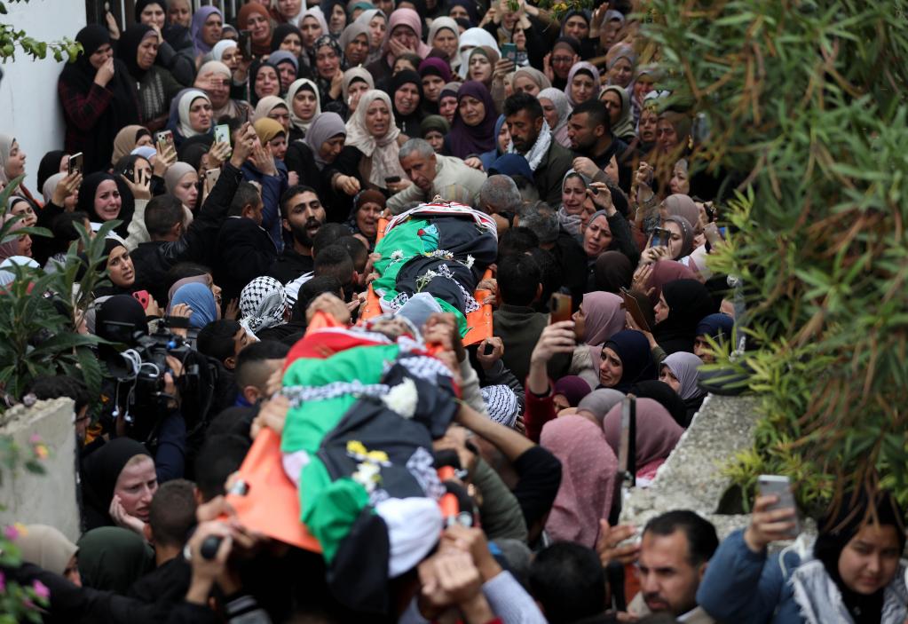 11月29日,在約旦河西岸城市拉姆安拉附近的拜特里馬,人們?yōu)楸灰陨熊婈牬蛩赖陌屠账固谷怂驮帷?/span>新華社發(fā)(艾曼·努巴尼攝)