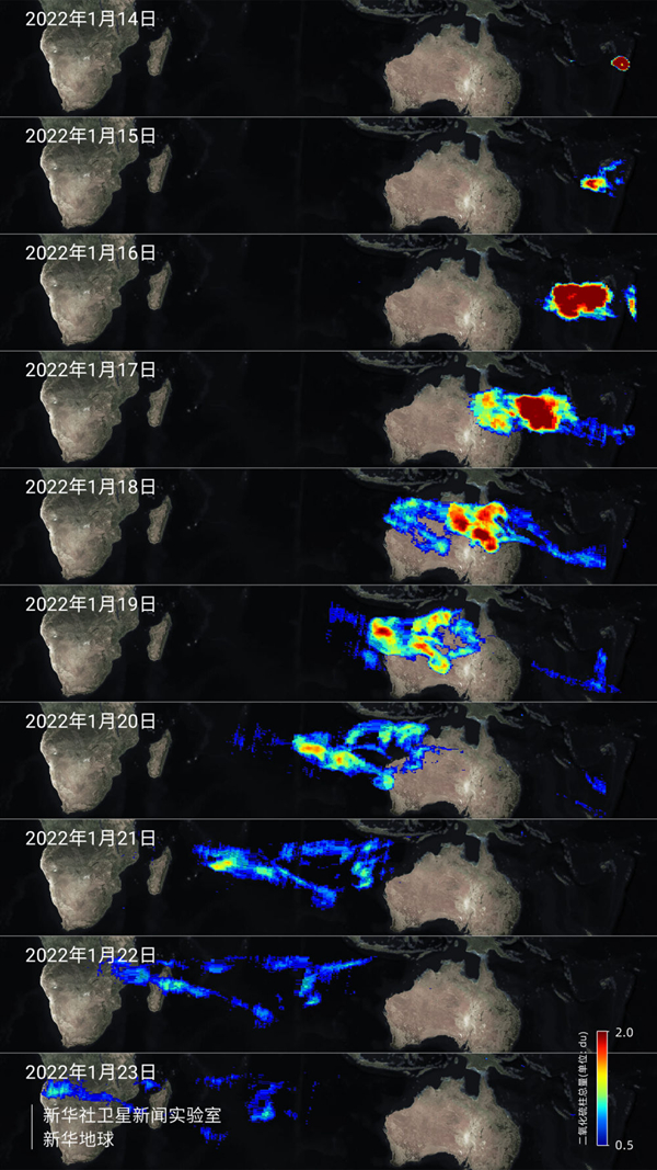 2022年1月,“高分五號”衛星觀測到湯加洪阿哈阿帕伊島海底火山噴發后產生的二氧化硫氣團飛越澳大利亞、印度洋,抵達非洲大陸西海岸。這次火山噴發是有儀器記錄以來地球大氣層內發生的“最大爆炸”。