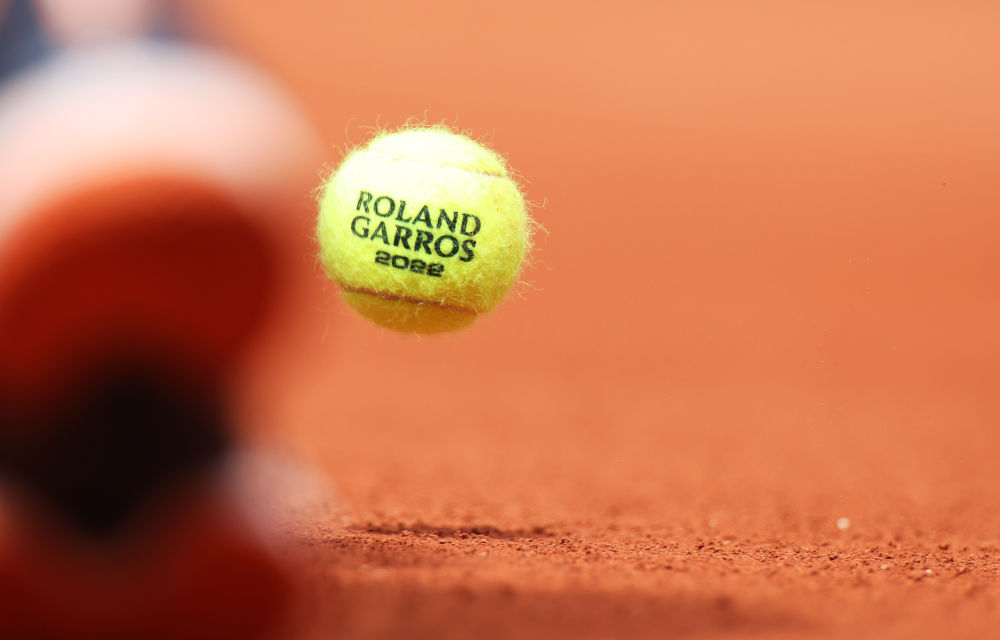 ↑2022年5月25日在2022法國網球公開賽比賽現場拍攝的一顆網球。