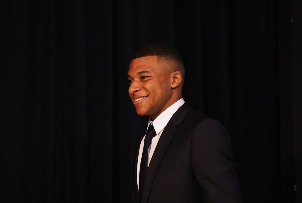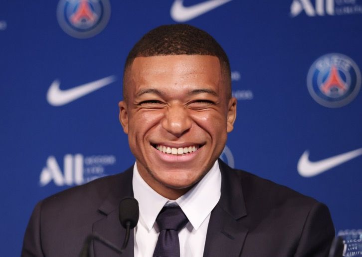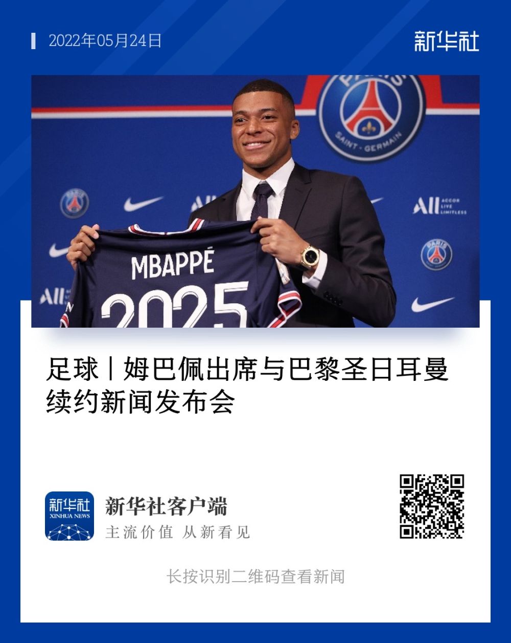 ↑2022年5月23日,在法國巴黎王子公園球場,姆巴佩出席與巴黎圣日耳曼俱樂部續約的新聞發布會。