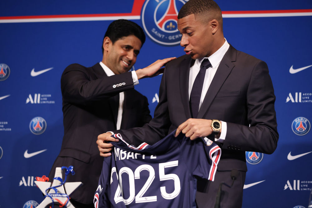 ↑2022年5月23日,在法國巴黎王子公園球場,姆巴佩(右)與巴黎圣日耳曼俱樂部主席納賽爾出席與巴黎圣日耳曼俱樂部續約的新聞發布會。