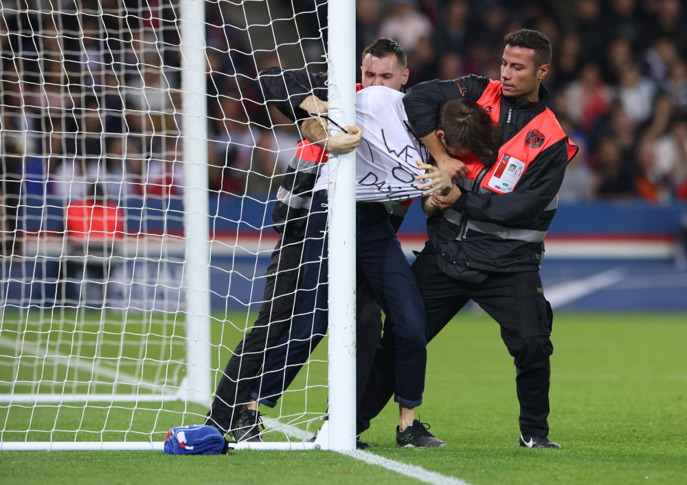 ↑2022年10月16日,在2022-2023賽季法國足球甲級聯賽第11輪比賽中,安保人員將闖入球場的示威者抬走。