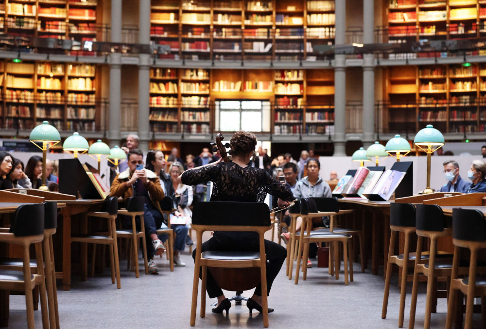 ↑2022年9月17日,在位于巴黎的法國國家圖書館黎塞留館,人們在“橢圓大廳”聆聽大提琴家的表演。