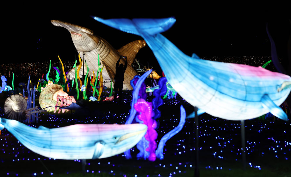 ↑2022年10月26日,在法國巴黎近郊的圖瓦里動物園,一名參觀者在媒體預展上為燈飾拍照。