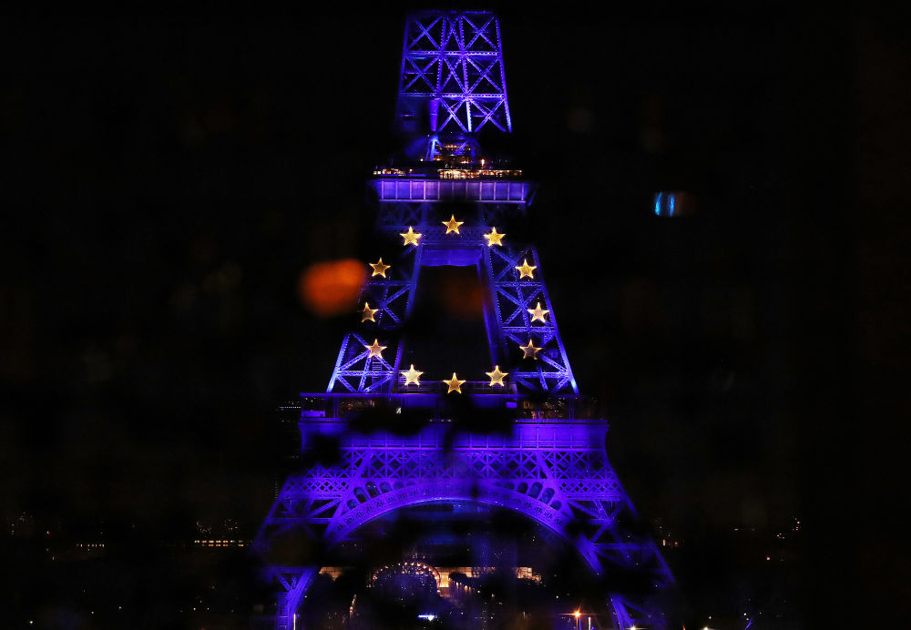 ↑2022年1月1日拍攝的被藍色燈光點亮的埃菲爾鐵塔。當日,法國多地地標建筑相繼點亮象征歐盟旗幟顏色的藍色,慶祝法國輪任歐盟主席國。