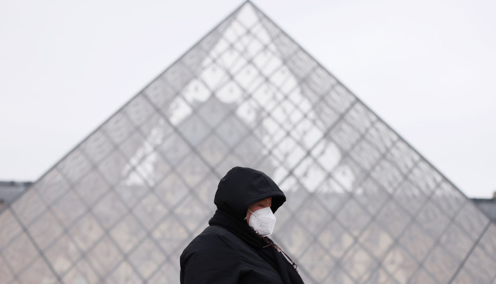 ↑2022年1月19日,一名女子走過法國巴黎盧浮宮的玻璃金字塔。