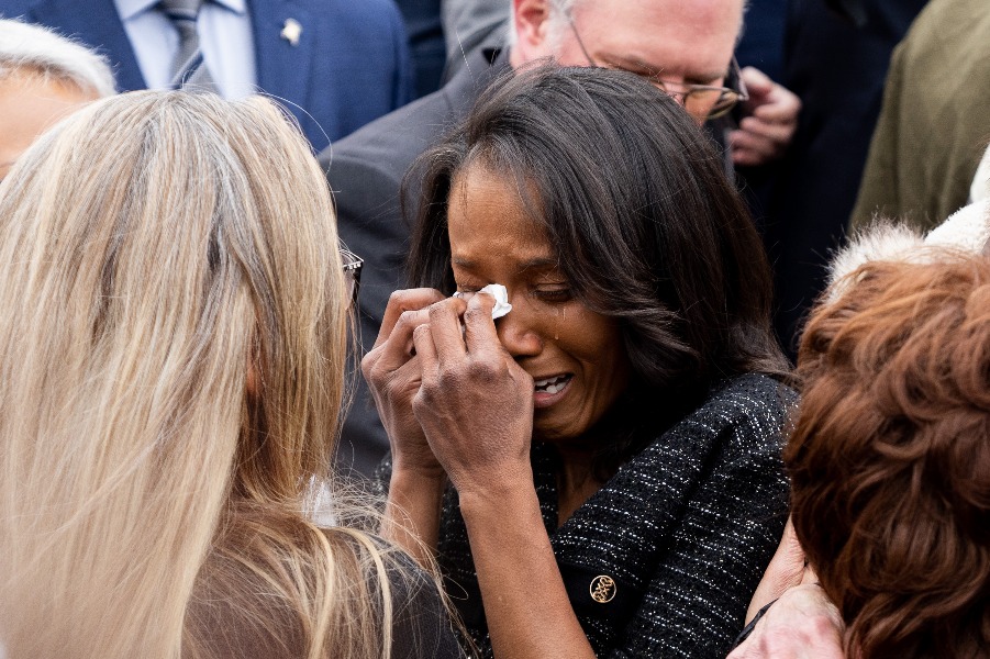 1月6日,在美國首都華盛頓的國會大廈外,一名前國會警察遺孀在紀(jì)念“國會山騷亂”兩周年紀(jì)念儀式上流淚。新華社記者劉杰 攝