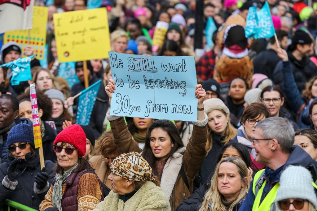 2月1日,人們在英國倫敦參加罷工游行。當(dāng)日,約50萬英國教師、火車司機和公務(wù)員舉行罷工,要求增加薪酬。新華社發(fā)
