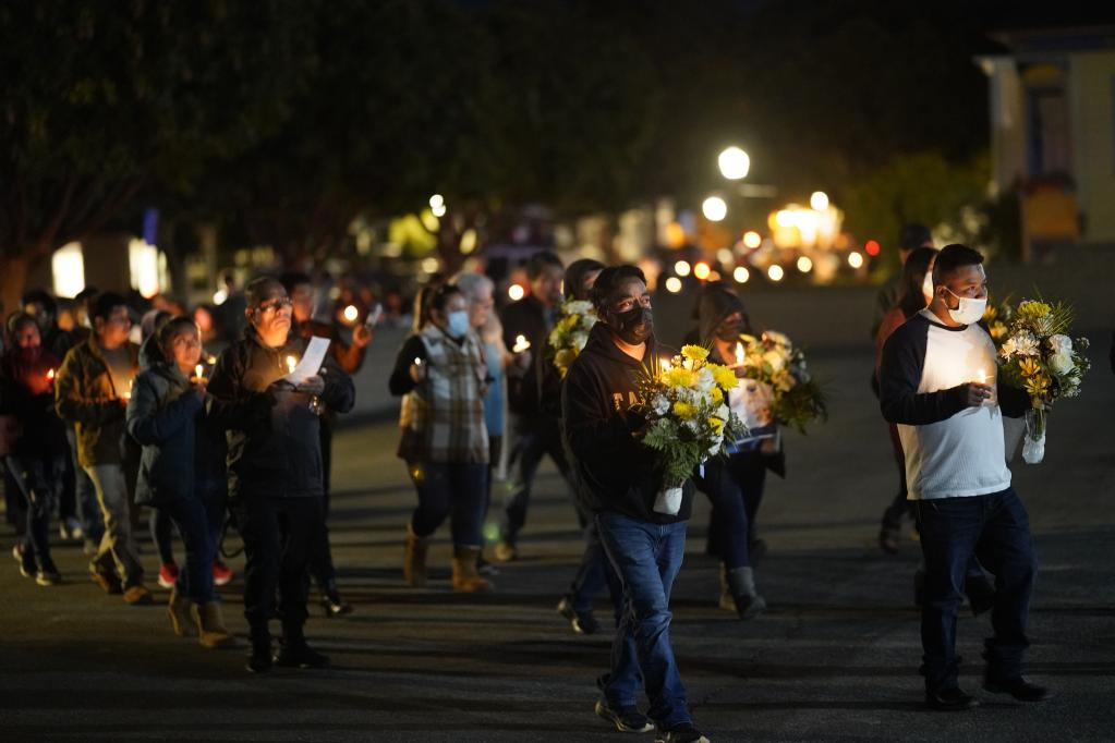 1月31日,在美國加利福尼亞州半月灣市,人們手持蠟燭和鮮花哀悼幾天前槍擊事件中的遇難者。該市1月23日發生嚴重槍擊事件,造成7人死亡、1人受傷。新華社記者 吳曉凌 攝