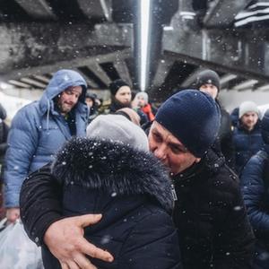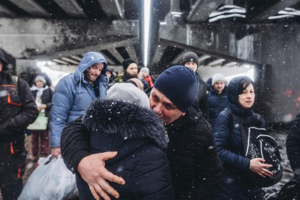 這是2022年3月8日,一對情侶在烏克蘭伊爾平告別。新華社發(迭戈·埃雷拉攝)