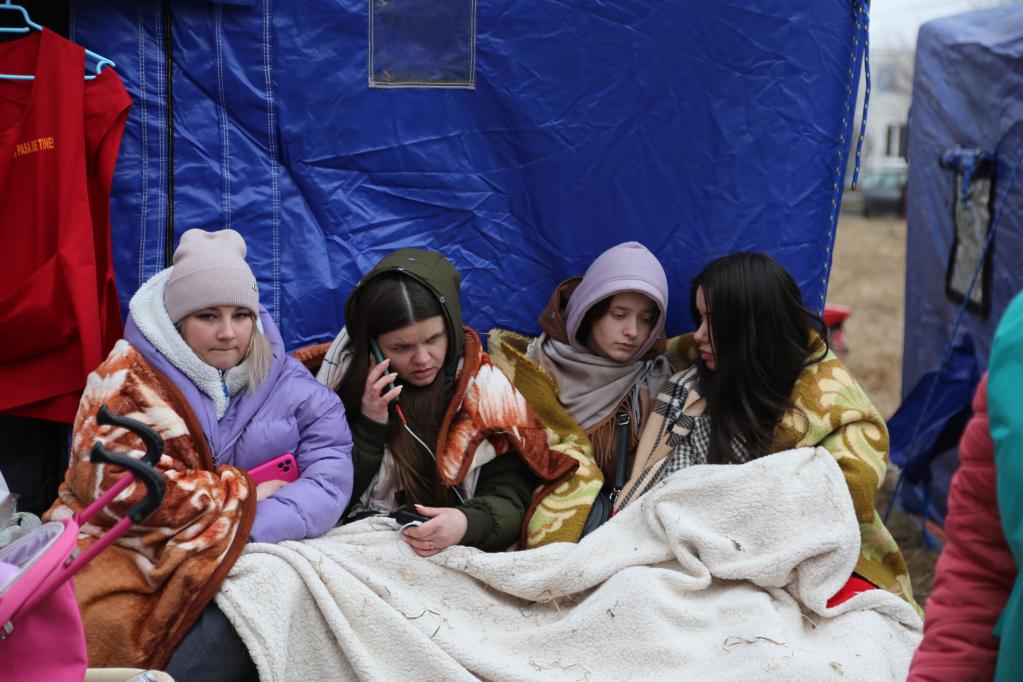 2022年2月27日,在羅馬尼亞北部與烏克蘭接壤的錫雷特邊境關口,烏克蘭女子在帳篷外打電話。(新華社記者 林惠芬 攝)