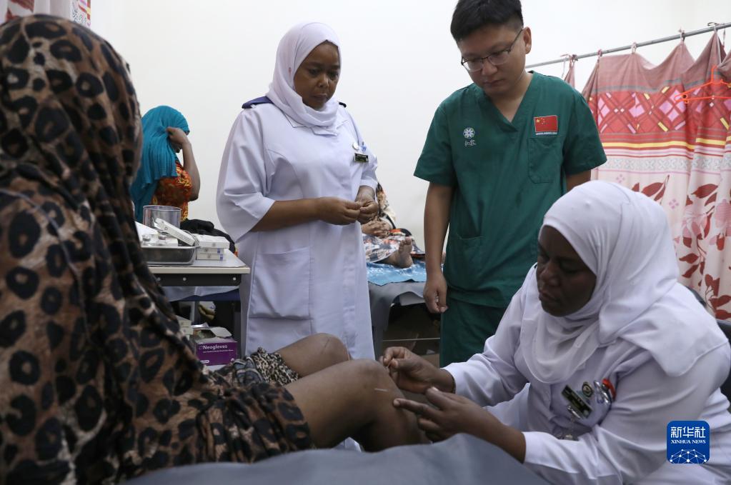 2月22日,在坦桑尼亞桑給巴爾島納茲莫加醫院,針灸科醫生劉亞健(右二)查看當地醫生給病人針灸。