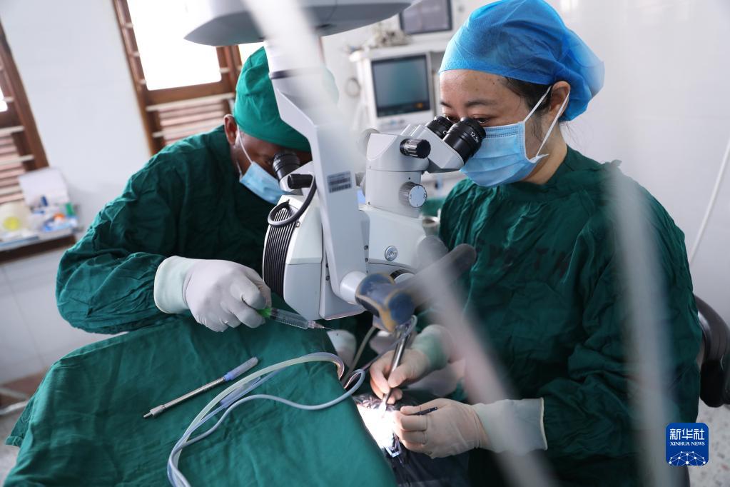 2月23日,在坦桑尼亞桑給巴爾島納茲莫加醫院,眼科醫生董莉莉(右)給病人做白內障超聲乳化摘除手術。