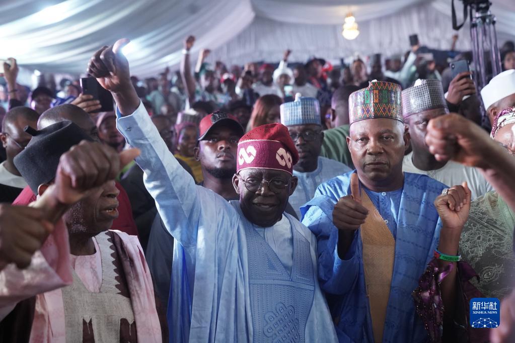 3月1日,在尼日利亞首都阿布賈,尼日利亞當選總統博拉·蒂努布(前中)與支持者一道慶祝勝選。新華社發(埃馬·奧索蒂 攝)