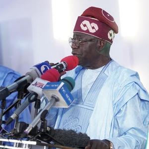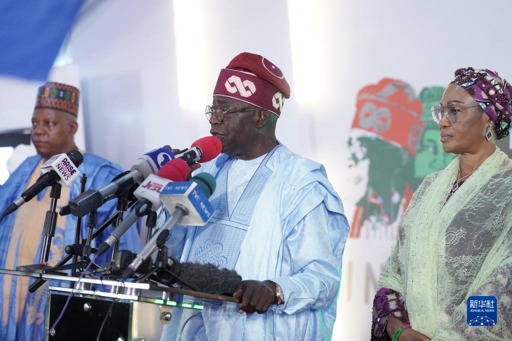 3月1日,在尼日利亞首都阿布賈,尼日利亞當選總統博拉·蒂努布(中)發表勝選講話。新華社發(埃馬·奧索蒂 攝)