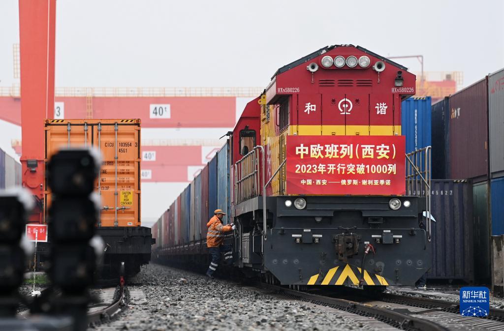 在西安國際港站,X8489次中歐班列準備駛往俄羅斯謝利亞季諾(2023年3月23日攝)。新華社記者 李一博 攝