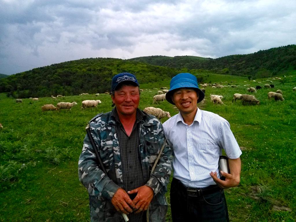 2017年,陜西省考古研究院赴哈薩克斯坦考古隊現場負責人丁巖與哈薩克斯坦牧羊人合影。(受訪者供圖)