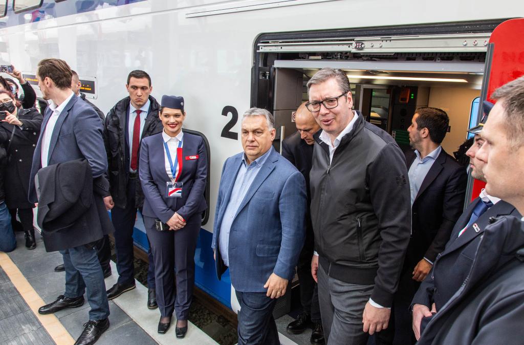 2022年3月19日,匈塞鐵路塞爾維亞境內(nèi)貝諾段開通運(yùn)營。塞爾維亞總統(tǒng)武契奇(中右)和匈牙利總理歐爾班(中左)乘坐列車抵達(dá)諾維薩德火車站。新華社發(fā)(王韡攝)