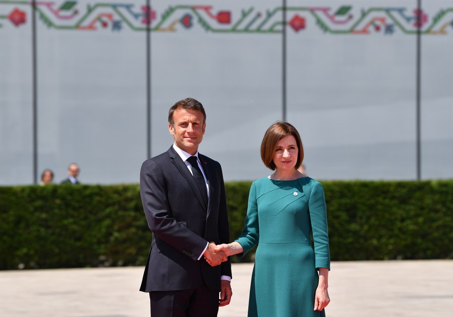 6月1日,在摩爾多瓦布爾博阿克,摩爾多瓦總統(tǒng)桑杜(右)歡迎前來參加第二屆歐洲政治共同體領(lǐng)導(dǎo)人會(huì)議的法國總統(tǒng)馬克龍。新華社記者連漪攝
