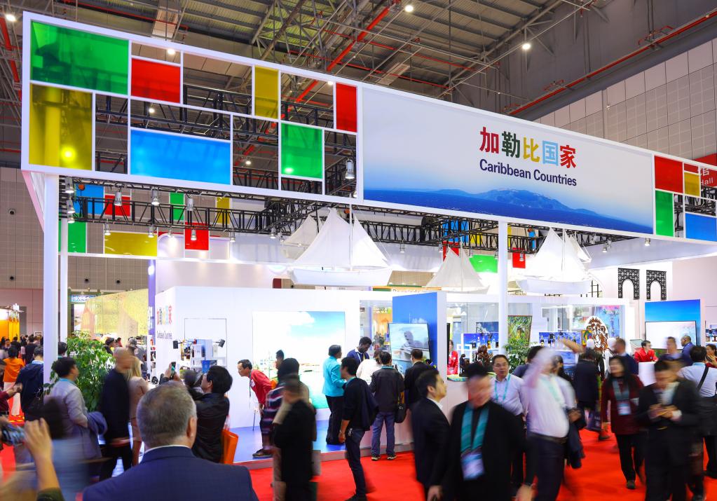這是2018年11月6日在上海舉行的首屆中國國際進口博覽會上拍攝的加勒比地區國家展區。新華社記者劉大偉 攝
