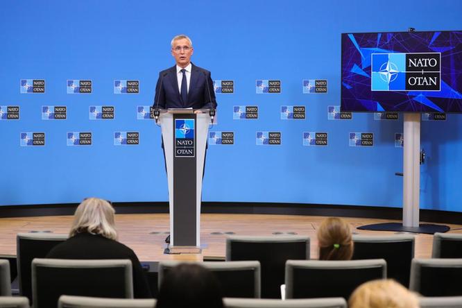 2022年6月16日,在比利時布魯塞爾的北約總部,北約秘書長斯托爾滕貝格在北約成員國國防部長會議后的新聞發(fā)布會上發(fā)言。新華社記者鄭煥松攝