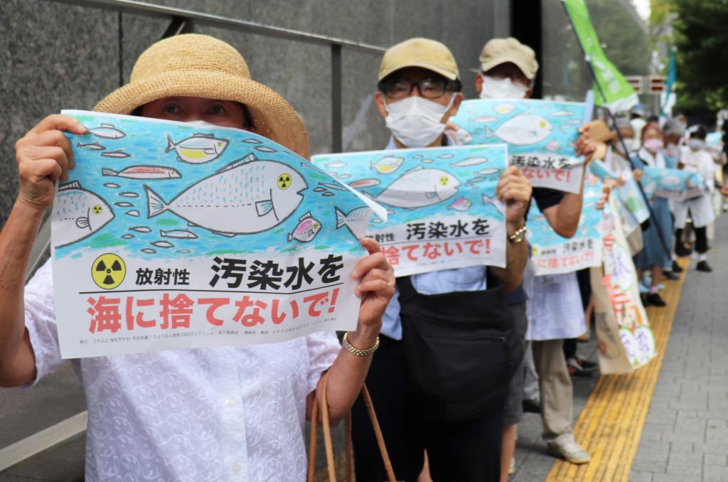 8月24日,日本民眾手持“不要將污染水扔進大海”等標語在東京電力公司總部前集會,抗議日本政府和東電公司無視民意啟動核污染水排海。新華社記者楊光攝