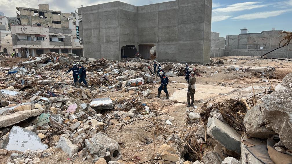 9月17日,國際救援人員在利比亞德爾納的建筑廢墟上工作。新華社發(fā)(哈姆扎·圖爾基亞攝)