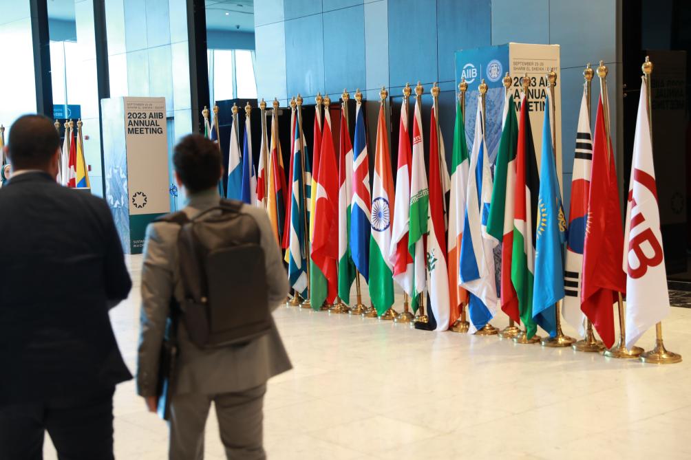 9月26日,在埃及沙姆沙伊赫舉行的亞投行第八屆理事會(huì)年會(huì)期間,參會(huì)者走過亞投行成員國國旗。新華社記者隋先凱攝