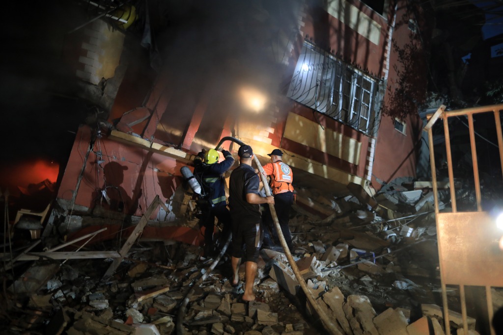 10月8日,巴勒斯坦民防人員在加沙地帶南部城市汗尤尼斯一處被以色列空襲的民宅滅火。新華社發(亞西爾·庫迪攝)