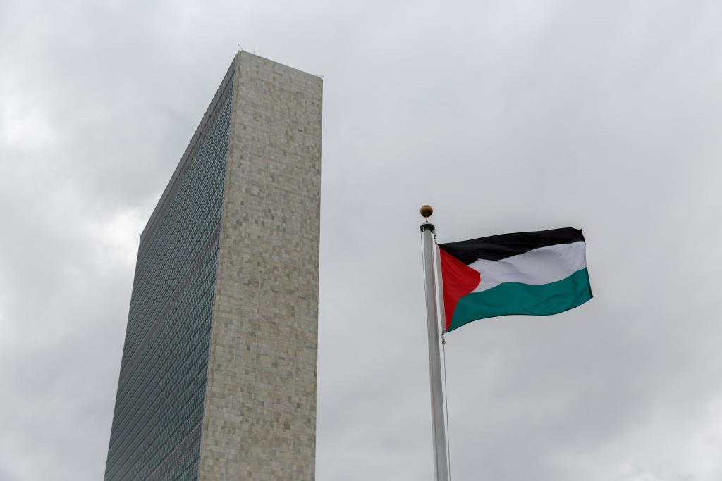 2015年9月30日,紐約聯(lián)合國總部升起巴勒斯坦國旗。新華社記者李木子攝