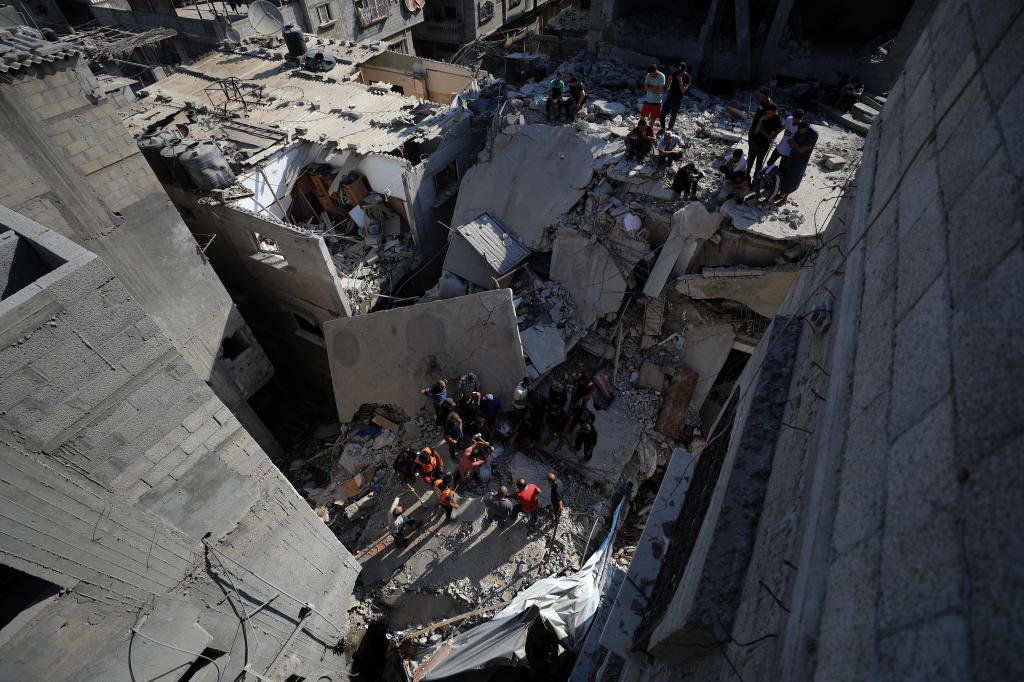 11月1日,在加沙地帶南部城市汗尤尼斯,人們在遭以色列襲擊后的建筑廢墟進行搜救工作。新華社發(亞西爾·庫迪攝)