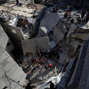 在加沙南部汗尤尼斯一個被夷為平地的街區,人們在廢墟中不斷挖掘。當11歲的西拉·哈姆丹被人們從破碎的水泥塊中抬出,她的身下還躺著9歲的妹妹蒂拉。人們用花床單把兩個女孩裹起來,送往太平間。
