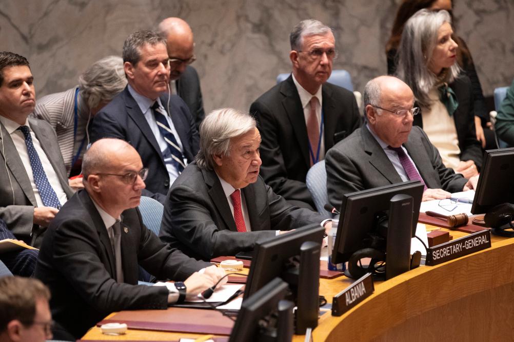 10月24日,在位于紐約的聯合國總部,聯合國秘書長古特雷斯(前中)在安理會巴以局勢高級別會議上講話。新華社記者謝鍔攝