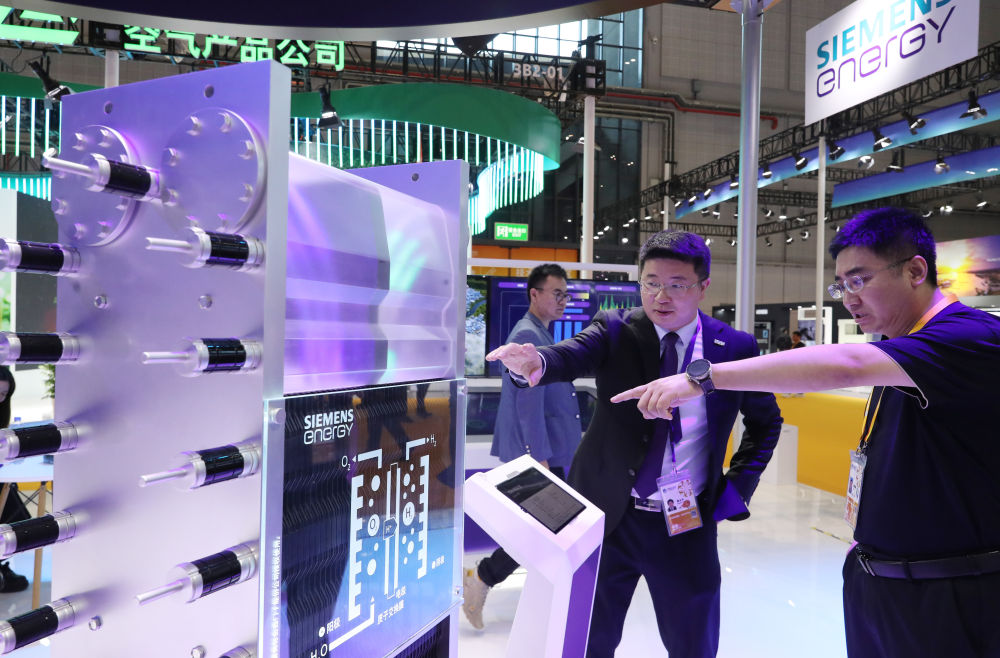 11月5日,工作人員(左)介紹第六屆進博會西門子公司展出的電解水制氫裝置模型。新華社記者 方喆 攝