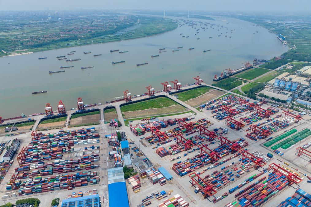 武漢陽邏港一期碼頭(2023年7月5日攝,無人機照片)。新華社記者伍志尊攝