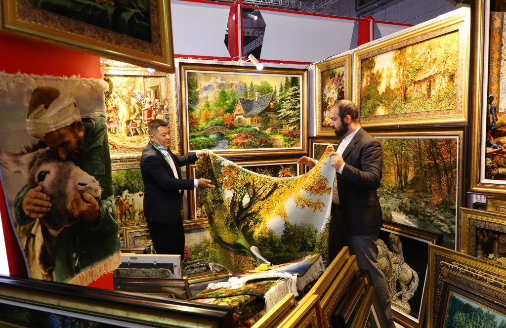 2023年11月10日,在第六屆進博會上,一名參觀者在一家伊朗手工掛毯展位上查看一款風景畫掛毯。新華社記者方喆攝