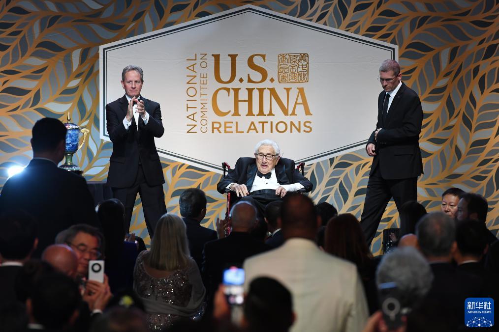 2023年10月24日,美國前國務卿亨利·基辛格(中)出席在紐約舉行的美中關系全國委員會年度頒獎晚宴。? 新華社記者 李睿 攝