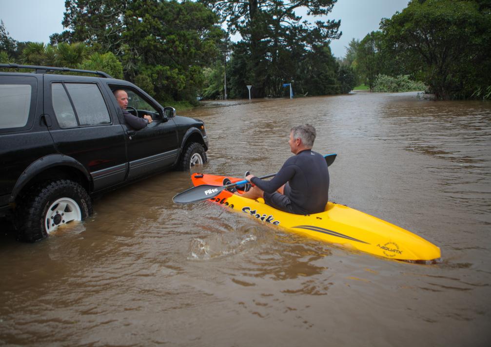 圖為2023年2月14日,在新西蘭奧克蘭,一名男子在積水路段劃船出行。新華社發(趙綱 攝)