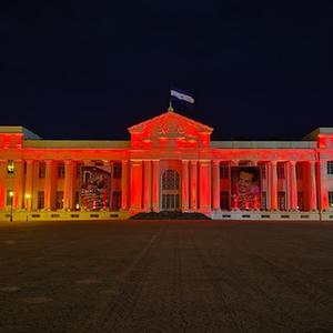 2022年1月31日,尼加拉瓜首都馬那瓜市中心標志性建筑國家宮點亮“中國紅”。新華社發(fā)(中國駐尼加拉瓜使館供圖)